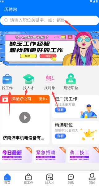 1、在首页,能够在搜索栏搜索匹配岗位,还能够点击找工作和找人才板块;