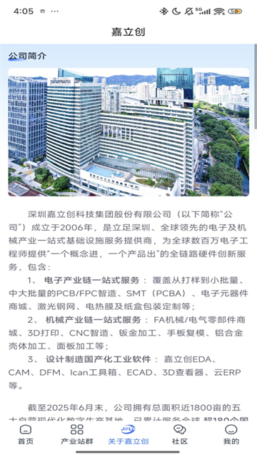 1、下载安装嘉立创app,打开软件,在首页可以看到嘉立创的产品和基地设备,当然还有更多关于嘉立创的内容可以了解;