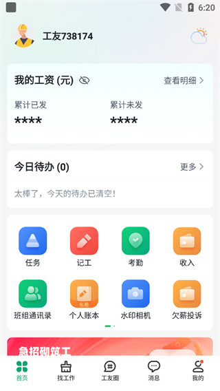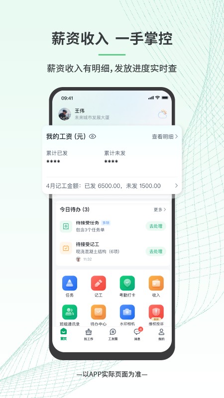 安心筑工人版是专门为工人们打造的工资体系记录工具,有了它就可以精准的记录自己的工作考情了,按照工资的标准可以直接得出用户所获得工资数目,发薪时能够更加的明确,同时每天都会有待办事项提醒,帮你减少出现纰漏的问题,提高工作效率的同时收获更多薪水。