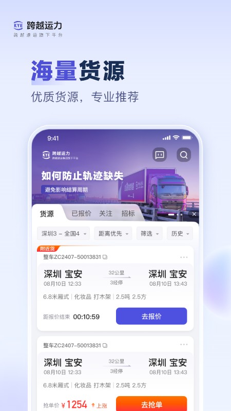 跨越运力司机版是一款专门为货运司机们准备的线上接单工具,它结合了互联网的便捷特性,打造出更加轻松的简单平台,货运司机师傅们可以在上面查找各种货运订单接取,大量免费的货源,同时还会有着高昂的运输报酬,平台也会在运输过程中给予司机行驶中的帮助,给大家带来更完美的使用体验。