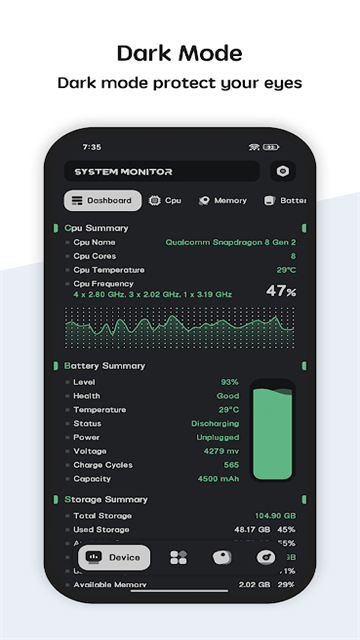 实时监测 CPU的温度和频率,分析 CPU温度和频率的历史使用数据,并且支持多核 CPU频率的同时监测,同时提供各个应用的 CPU温度排行榜。