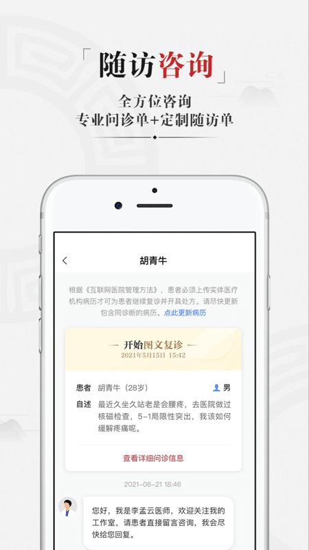 管理新老患者,历史处方一键重开,线上调药复诊轻松解决,增强患者求医时效性,提升中医师口碑。