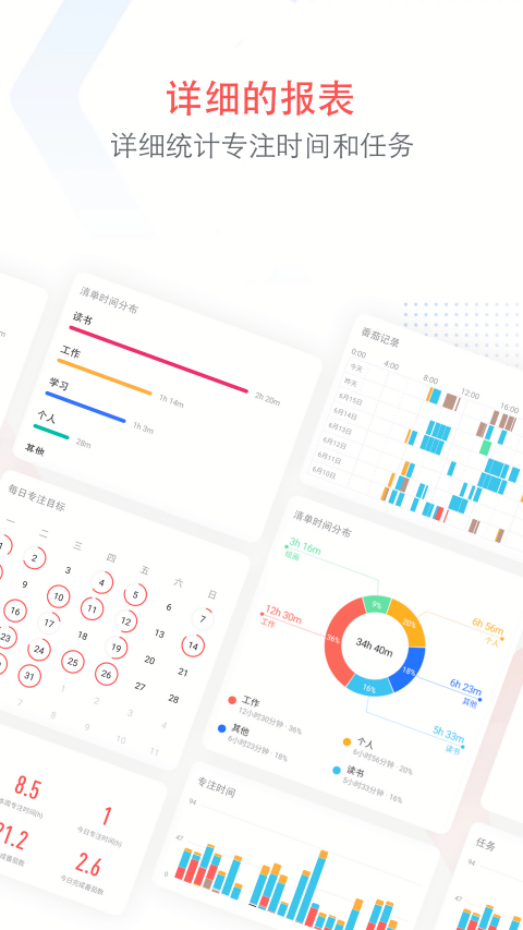 3、报表:记录自己点滴的成长历程,记录所有的任务和专注时间