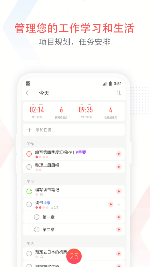 任务优先级,用颜色区分任务的优先级,标示您一天中最重要的活动。
