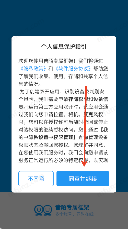 1、打开昔陌专属框架app点击同意并继续