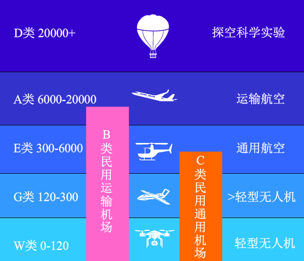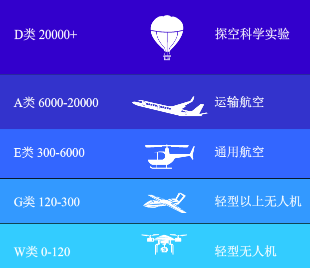 2023年12月21日,中国民用航空局发布《国家空域基础分类方法》,依据航空器飞行规则和性能要求、空域环境、空管服务内容等要素,将空域划分为A、B、C、D、E、G、W等7类,其中,A、B、C、D、E类为管制空域,G、W类为非管制空域。