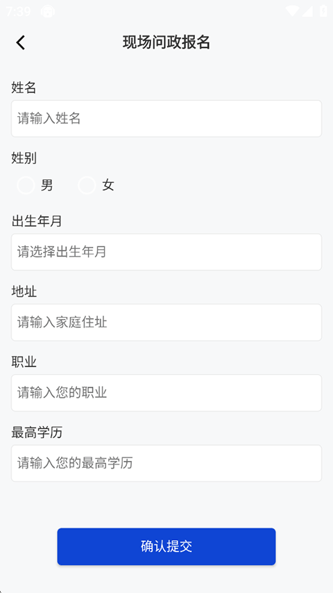 2、填写现场问政报名表,例如姓名性别出生年月等信息,完成后点击确认提交。