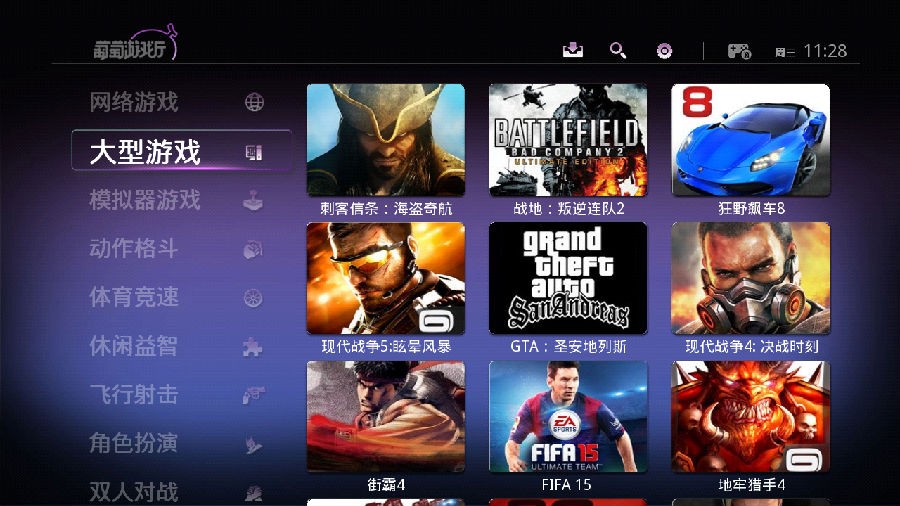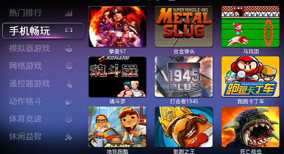 1、在电视端打开『葡萄游戏厅』,从左侧导航就可以找到各路经典好玩的游戏,当然如果木有游戏手柄,建议大家进入“手机畅玩”分类下,这里的游戏都是支持手机当手柄滴!