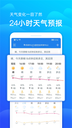 提供了二十四小时以内的逐小时预报信息,随时可以查看每个小时的天气信息;