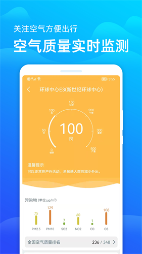 展示了所在城市的实时空气质量信息,可以掌握整个城市的空气污染指数;