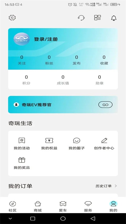 1、下载安装奇瑞汽车app官方版,打开软件进行注册登录,点击爱车、或者我的板块我的车辆;
