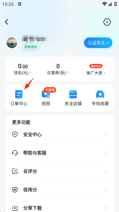 4、下单后点击左上角的个人头像进入个人中心,在订单中心查看订单详情;