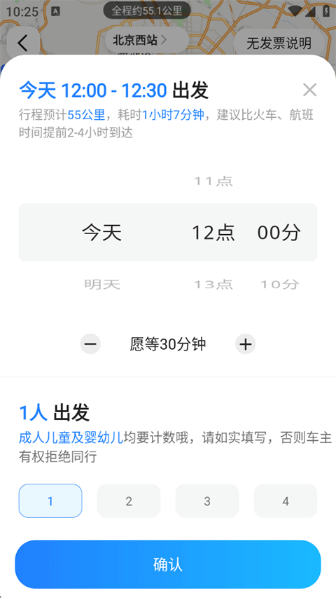 2、选择出发时间,人数以及愿等时间等,点击确认;