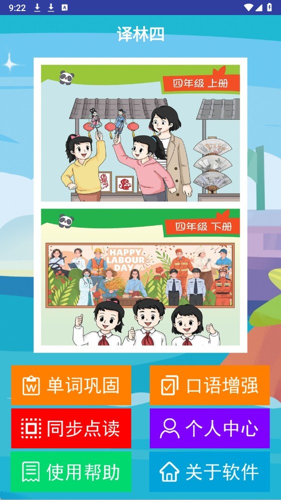 一、打开译林牛津英语四软件,在首页可以看见教材课本、单词巩固、口语增强等多个模块