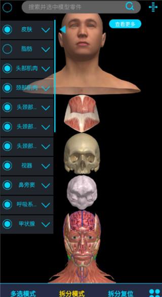 【快速解剖】点击开启快速解剖功能,拖动滑块上下滑动可以实现整组模型由浅到深的快速显隐效果。