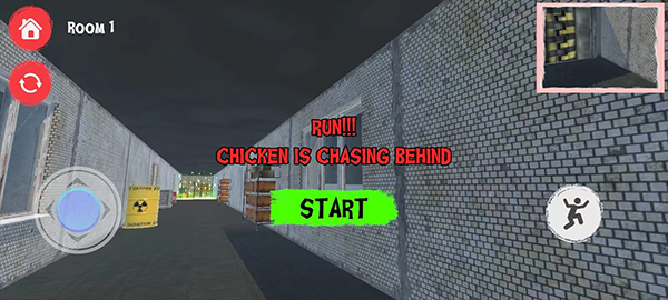 2、新手进入第一关时请注意先操作左边的方向盘和右边的跳跃键跑过绿光墙的另一边安全区域然后再点击Sart,那个怪物鸡就会立即冲出来,你可以从右上角的小屏幕看到这只恐怖鸡的状态。