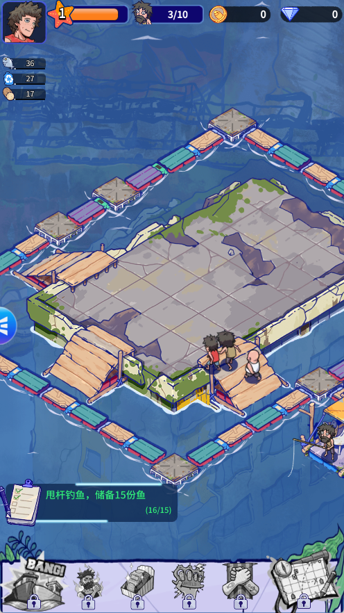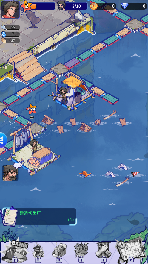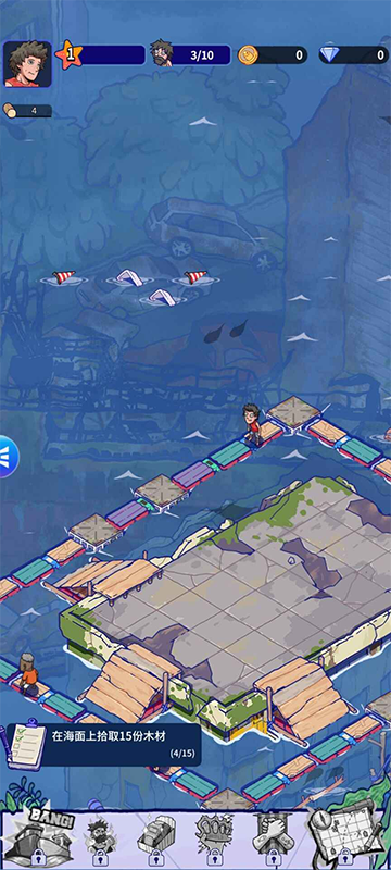 1、初始阶段资源少,第一目标就是收集漂浮资源,木板、绳索、金属、塑料。
