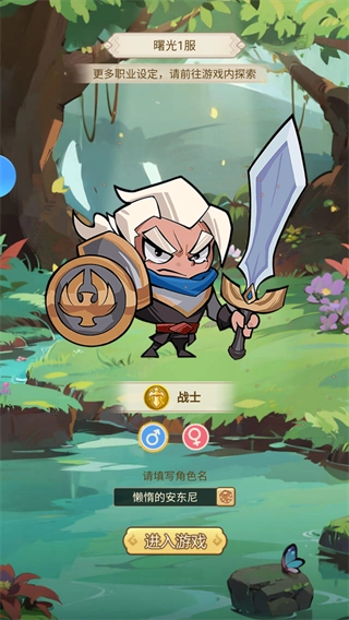 1、进入游戏后,玩家首先要完成实名认证,接着选择游戏区服。目前游戏里只有战士这一个角色,玩家为自己设置好名字和性别后,点击“进入游戏”就能进入希望大陆了。