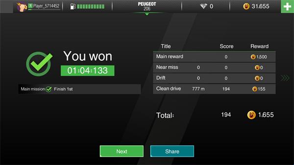 5、每完成一个任务都可以获得大量的金币,同时还可以看到自己的赛车时间;