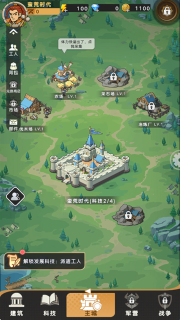 3、前期在蛮荒时代、石器时代、农耕时代,可以通过采集快速获得粮食、木材、石头,快速升级建筑