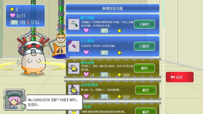 玩家可以使用战斗中获得的金钱和"种子"对最终兵器鼠鼠进行永久性强化,或解锁在后续战斗中更有利的武器。给最终兵器鼠鼠喂食"种子"可以提升信赖度,强化属性数值。培育和互动将直接影响战斗的体验感。