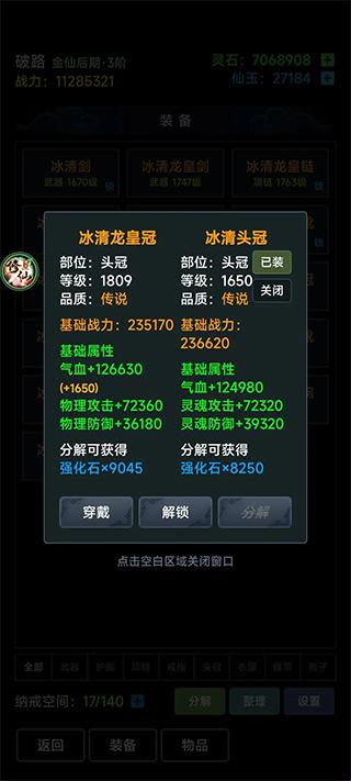 2、冰清龙皇装别一键换装,只换血量多的跟灵魂防御的,龙皇装部分位置的是偏攻击的。换了反而血量降了,推图更难了。